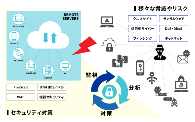 そのため、SIEM(Security Information and Event Management;セキュリティ情報/イベント管理システム)を使用したログ・イベント監視から、分析結果を受けての各種セキュリティ設定、攻撃があった際の分析結果を元にしたシグネチャ登録設定、さらにはセキュリティアナリストによる簡易な二次分析まで対応いたします。